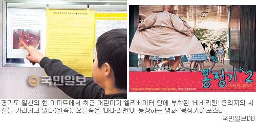 ◇'희화화한 범죄자'를 보는 엇갈린 시선들=지난 7일 경기도 고양시 화정동의 한 아파트 엘리베이터 부근에 바바리맨이 나타났다. 파란색 쫄티와 청바지 차림에 모자를 눌러 쓴 10대 후반∼20대 초반의 이 남자는 1층에서 서성이다가 엘리베이터에서 내리는 여학생 앞에서 갑자기 자신의 신체 일부를 노출하는 전형적인 바바리맨이었다. 불안해진 주민들은 "우리 아이들 어떻게 하나"라며 경찰에 신고하고 엘리베이터 내에 경고문까지 붙여놨다. 이같은 바바리맨의 출몰은 전국적으로 나타나고 있다. 부산에서는 지난 14일, 전남 순천에서는 지난 10일 패스트푸드점 등에서 신체 일부를 노출한 바바리맨들이 경찰에 붙잡히기도 했다.