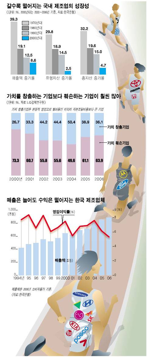 제조업 사정도 다를 것은 없다. 각종 성장성 지표는 2000년대 들어 90년대의 절반 이하로 뚝 떨어졌다. 특히 기업의 투자를 의미하는 유형자산증가율이 14.5%에서 2.5%로 급감했다. 외환위기 이후 우리 기업들이 구조조정 과정에서 투자를 가장 먼저 줄였기 때문이다. 투자 없이는 미래를 담보하기 어렵다는 점에서 우려되는 부분이다.