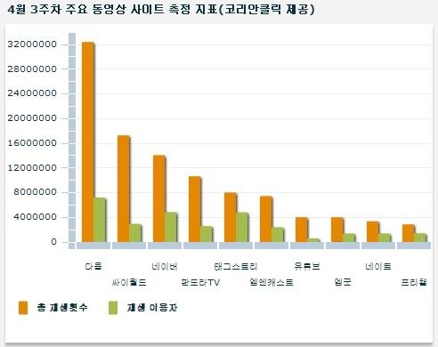 코리안클릭이 조사한 동영상 총 재생횟수(TS, 토탈 스트림) 통계에 따르면 4월 3주차 다음 TV팟의 동영상 총 재생횟수는 3천 2백만여회로 싸이월드(1천 7백만)와 네이버(1천 4만), 판도라TV(1천만)를 제치고 1위를 차지한 것으로 나타났다.
