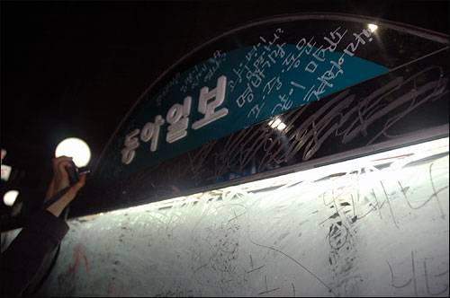 촛불집회가 끝나고 귀가하는 순간에도 시민들은 <동아일보>를 놔주지 않았다. 본관 앞에 위치한 신문 게시판은 그야말로 '화장실 낙서판'이 됐다. 귀가하던 사람들이 <동아>에 대한 불만을 게시판 안에다 숨김없이 쏟아냈기 때문이다.