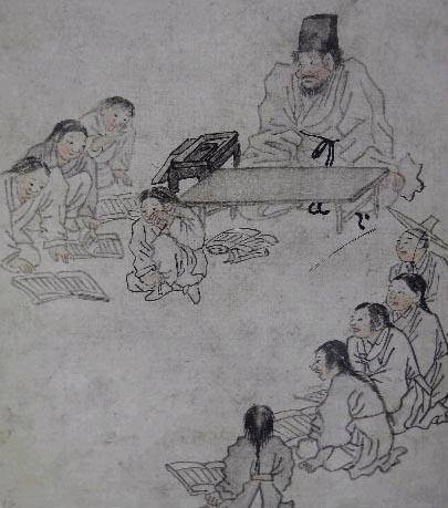 초학자를 가르치는 서당의 교육은, 선생님이 먼저 한문으로 쓰인 교과서를 천천히 읽고 한자의 음과 뜻을 일러주면, 학생들은 따라 읽고 머릿속에 새긴다. 그리고 선생님이 문장의 뜻을 천천히 새겨준다. 간단히 말하면 이것으로 끝이다. 학생들은 그 날 배운 한자를 반복해 쓰고, 문장을 외운다. 서당에 따라서는 그 날 배운 것을 그 날 테스트하는 경우도 있고, 다음날 테스트하는 경우도 있다. 테스트할 때 책을 등 뒤에 두고 전날 배운 부분을 암송하고, 번역하고 뜻을 풀이해야 한다. 만약 못하면 당연히 회초리가 따른다. 위 그림의 훌쩍이는 녀석은 테스트를 통과하지 못했기에 맞은 것이다.