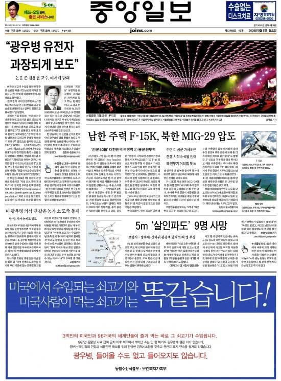| ▲ 미국산 쇠고기의 안전성을 강조하는 정부 광고를 하단에 게재한 5일자 중앙일보 1면. | ||