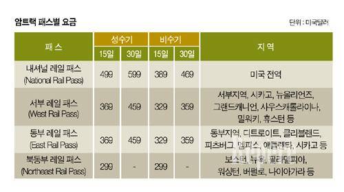 ▲암트랙 패스 = 철도 여행자를 위한 여행권으로 철로가 연결된 미국의 400여 개 도시와 캐나다를 여행할 수 있다. 성수기와 비수기 요금으로 구분되며 올해 성수기는 5월 23일~9월 1일까지이다. 만 15세 미만 어린이는 50% 할인이 적용된다.