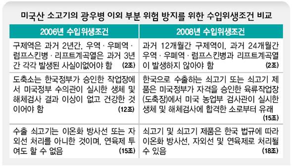 우선 2006년 1월 한-미가 합의해서 만든 '미국산 쇠고기 수입위생조건' 2조를 보면, '미국의 질병발생과 관련하여, 구제역은 수출쇠고기의 선적전 과거 2년간, 우역·우폐역·럼프스킨병·리프트계곡열은 과거 3년간 각각 발생된 사실이 없어야 하며, 이들 질병에 대한 예방접종을 실시하지 않아야 한다'고 규정하고 있다. 하지만 지난달 18일 타결된 새 수입위생조건에서는 '구제역의 경우 과거 12개월, 우역·우폐역·럼프스킨병과 리프트계곡열은 과거 24개월 동안 발생하지 않아야 한다'로 각각 1년씩 단축시켜줬다.