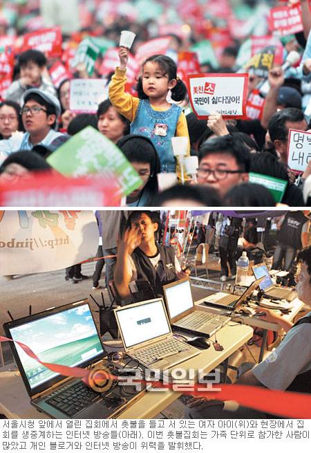포털사이트 다음이 운영하는 토론방 아고라는 이번 촛불집회의 실질적인 사령부라고 할 수 있다. 수많은 커뮤니티와 개인들이 접속해 정보를 모으고 토론을 벌이고 방향을 결정한다. 촛불집회 역시 개인과 커뮤니티, 오프라인 단체들의 네트워크로 볼 수 있다. 아고라의 오프라인 형태가 바로 촛불집회다. 온라인 커뮤니티에서 걸어나온 새로운 군중. 이들은 게시판과 댓글을 통해 '집단지성'을 창조하고, 이를 바탕으로 종종 정부, 전문가, 언론 등과 맞선다. 그리고 온라인에서 경험하고 훈련한 직접민주주의 방식을 현실에서 요구하기 시작했다. 박원석 공동상황실장은 양방향 소통과 합의를 원한다, 통일성이나 획일성을 거부한다, 다양성과 개성을 중시한다 등을 네티즌의 특성으로 꼽고, "이런 성향이 웹에서 오프라인으로 확산되고 있다"고 분석했다.