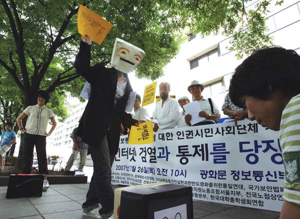| ▲ 지난해 7월 서울 광화문 정보통신부 앞에서 펼쳐진 인터넷 검열과 통제에 대한 퍼포먼스. (뉴시스) | ||