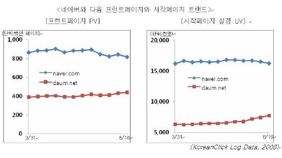27일 업계에 따르면 네이버와 다음 각각의 메인화면 방문 횟수(코리안클릭 조사) 흐름에서 네이버는 6월 첫째주에 트래픽 하락이 지속되면서 평균 수준으로 회복되지 못하고 있다. 다음이 최근 4주간 꾸준한 증가를 보이고 있는 것과 대조된다.