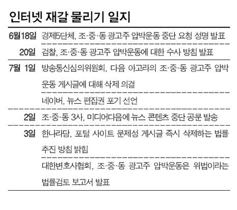 물론, 그 배후에는 조·중·동의 그림자가 어른거린다. <한겨레> 6월20일치 보도에 따르면 경제5단체가 네티즌들의 광고주 압박운동을 막아달라고 인터넷 포털에 요청한 것은 조·중·동의 요구에 따른 것이었다. 또한 경제5단체는 포털들에 정식 공문을 보낸 것도 아니고, 일종의 구두 협조만 구한 것으로 알려졌다. 조·중·동의 압력에 밀려 '억지춘향'을 한 방증이다.