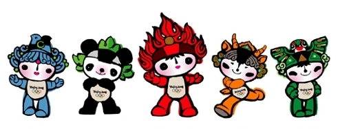 마스코트는 중국의 광활한 대지와 산하를 나타내는 이미지와 중국인이 좋아하는 동물로 구성돼 있다. 또 마스코트의 색깔을 파랑·검정·빨강·노랑·초록의 다섯 가지로 입혀 오륜(五輪)을 표현해냈다.