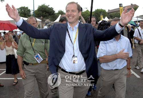 epa01411567 Tour de France director Christian Prudhomme of France waves after an impromptu press briefing before the start of the eighth stage of the Tour de France cycling race, between Figeac and Toulouse, in France, 12 July 2008. A doping scandal has struck the Tour de France after Liquigas team rider Manuel Beltran of Spain tested positive for EPO. EPA/NICOLAS BOUVY