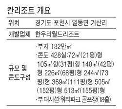 칸(Khan)리조트는 서울 강남권에서 40㎞ 떨어진 경기도 포천 일동면에 골프장 워터파크 스파 컨벤션센터 등을 갖춘 수도권 최대 규모의 종합온천리조트다. 165만㎡ 부지에 7000억원을 들여 개발하는 칸리조트는 내년 5월 준공될 예정이다.