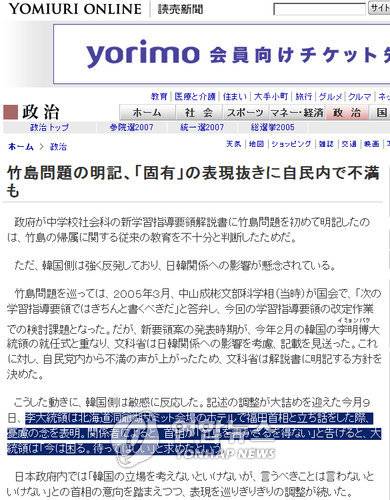 이에 앞서 요미우리신문은 "후쿠다 총리가 지난 9일 홋카이도(北海道) 도야코(洞爺湖)에서 열린 G8(선진8개국) 확대정상회의 도중 이 대통령과 정상환담을 가진 자리에서 일본 사회과 학습지도요령 해설서에 독도를 일본땅이라고 표기하겠다고 통고했으며 이 대통령은 `지금은 곤란하다. 기다려달라'고 말했다"고 보도했다.