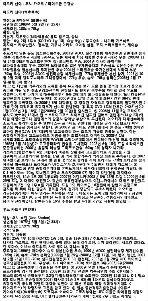 만 25세의 나이로 벌써 상당한 경력과 이야깃거리를 만든 아오키지만 상대인 우노는 자타가 공인하는 일본 종합격투기 라이트급의 살아있는 역사다. 고등학생부터 레슬링을 수련한 우노는 유술을 보완, 1999년 ADCC 실전레슬링 세계선수권 -76kg 2위라는 성과를 냈다.