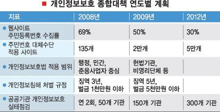 정부는 또 구글·야후·네이버 등 대형 인터넷 포털사이트에서의 개인정보 노출을 아예 차단하는 방안을 마련하기로 했다. 정남준 행안부 2차관은 "대형 포털 등이 처음부터 개인정보를 수집·보관하지 못하도록 규제하는 안과 개인정보를 두되 방화벽을 한층 강화하도록 하는 안을 추진하기로 했다."면서 "허술한 관리로 개인정보를 계속 노출시키는 포털 사이트의 경우 개인정보 검색 등 일부 기능을 차단할 수도 있다."고 말했다.