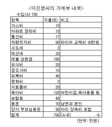 =두살짜리 아이를 둔 이씨 가정의 한달 수입은 남편 월급과 합쳐 730만원 정도. 적잖은 수입이지만 최근 지출이 크게 늘면서 6월 가계부가 소폭 적자를 기록하고 말았다.