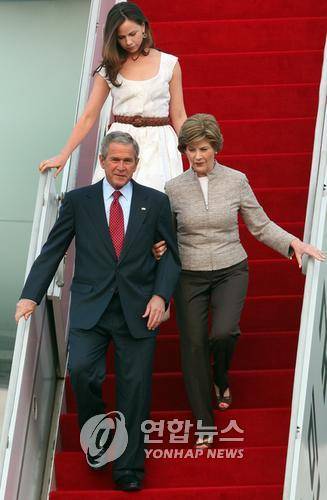 (성남=연합뉴스)이상학 기자 = 조지 부시 미국 대통령이 5일 오후 성남 서울공항을 통해 입국, 비행기 트랩을 내려오고 있다.부시 대통령은 이날 휴식을 취한 뒤 6일 이명박 대통령과 청와대에서 정상회담을 갖고 한미동맹의 미래지향적 발전 방향에 대한 큰 틀의 원칙을 제시하는 공동성명을 발표할 예정이다.