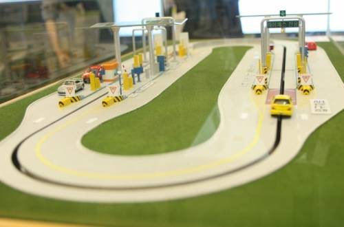 하이패스 시스템 미니어처. 왼쪽은 일반 차로, 오른쪽은 하이패스 차로를 보여주고 있다. |