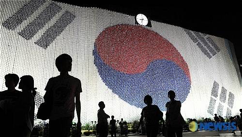 제63주년 광복절 및 대한민국 건국60주년 기념을 하루앞둔 14일 오후 서울시청 본관에 설치된 '태극기 모뉴먼트'가 시민들의 눈길을 끌고 있다. /허경기자 neohk@newsis.com