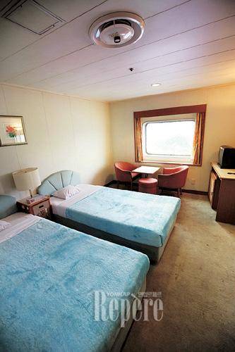 출항 1시간 전인 오후 4시에 출국 수속을 시작했다. 10분 만에 수속을 마치고 배에 탑승해 직원에게 표를 보여주자 열쇠를 건네준다. 침대 2개가 가지런히 놓여 있는 '로열' 룸은 일본의 비즈니스호텔 객실을 연상시킨다. 별도의 화장실이 딸려 있고 텔레비전과 탁자, 옷장도 비치돼 있다.