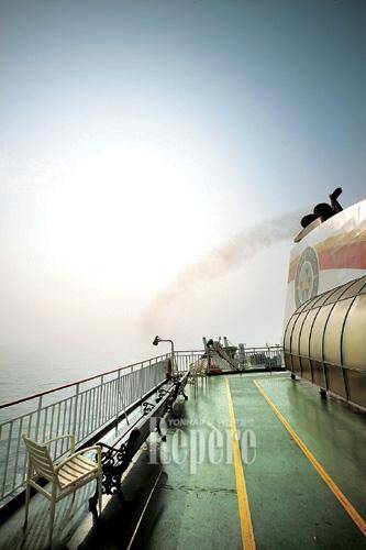 배는 인천항에서 한참을 대기한 뒤에야 속도를 높였다. 갑판에서는 사람들이 삼삼오오 모여 상쾌한 바닷바람을 쐬며 아스라이 멀어져가는 육지를 바라보았다. 바다 위에 떠 있는 배들의 숫자가 줄어들 즈음, 사위는 수평선만이 남았다.