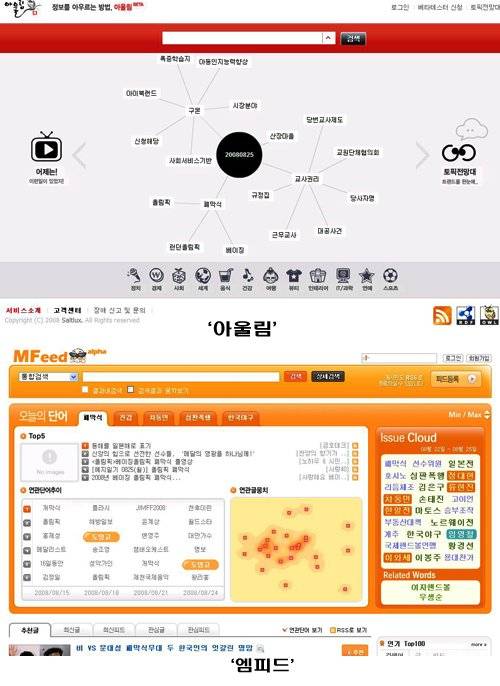 베타 서비스 중인 아울림은 정보의 의미 관계를 밝히는 토픽 서치 기술을 적용해 동일한 사회적 이슈에 대해 다양한 관점으로 검색결과를 제공하는 것이 특징이다. 예를 들어 `촛불집회'를 검색하면 정치분야에서는 `국정쇄신', IT분야에서는 `집단지성'과 같이 사용자 관심에 따라 각기 다른 의미의 관계를 부여하고 토픽간의 네트워크를 구축해 새로운 정보 관계를 보여준다. 토픽간 네트워크는 시간에 따라 변해 촛불집회라는 토픽의 시간 축을 2002년으로 이동하면 `미군 장갑차'와 같은 해당 시기 이슈를 보여준다.