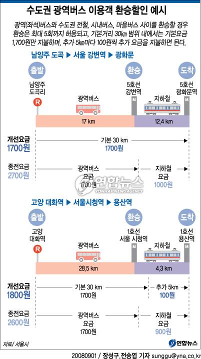 이 제도가 시행되면 경기직행 좌석형버스(7770번)를 27㎞ 이용한 후 사당역에서 지하철 2호선을 12㎞ 이용해 잠실역까지 총 39㎞를 이동하는 경우 이용요금이 현재는 2천700원(좌석버스 1천700원 + 지하철 1천원)이었으나 앞으로는 1천900원(기본 30㎞ 1천700원 + 추가 6㎞ 200원)만 지불하면 돼 800원을 절약할 수 있게 된다.