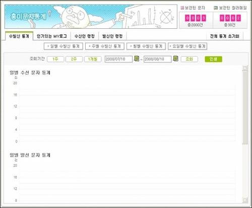 흥미문자통계를 이용하면 일/주/월/요일별 메시지 수신-발신 통계를 확인할 수 있으며 일종의 분류별 보관함인 MY로그 폴더별 저장 개수 및 수신인과 발신인의 순위를 알 수 있다.