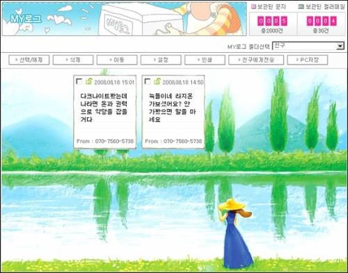 지금까지는 기본 사용법이었고 이번에는 문자매니저에 있어서 일종의 정리/보관함 역할인 MY로그와 포토로그를 보도록 하자. 이 두 메뉴 다 문자함에 있는 메시지를 정리하고 관리하는 역할을 한다. 먼저 MY로그를 보자.