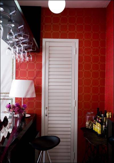 거실 코너에 와인바를 꾸밀 때는 거실의 분위기와 조화를 이뤄야 하는 만큼 가구 색깔과 스타일에 잘 어울리는 홈바 테이블과 의자를 고르는 게 중요하다. 와인바의 분위기를 살리려면 화려하고 강렬한 컬러의 벽지로 벽면에 포인트를 주고 조도가 낮은 부분조명을 적극적으로 활용하면 좋다.