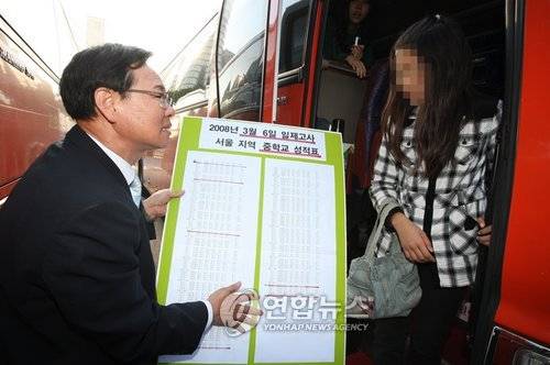 (서울=연합뉴스) 박지호 기자 = 초등학교 6학년 등을 대상으로 한 '일제고사' 실시일인 14일 오전 '학교를 사랑하는 학부모 모임' 최상기 공동대표가 서울 광화문 동화면세점 주차장에서 일제고사를 거부하고 생태학습을 떠나려는 한 학생에게 '2008년 3월 6일 일 일제고사 서울지역 중학교 성적표'를 들이밀며 학교로 돌아갈 것을 호소하고 있다.