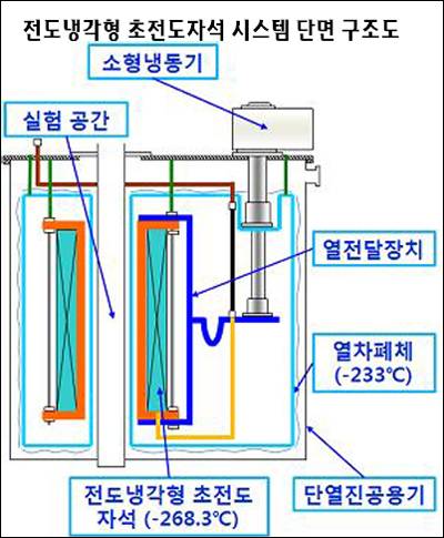 한국기초과학지원연구원 고자기장연구팀의 김동락 박사는 '전도냉각'원리를 이용, 값비싼 액체 헬륨 등의 냉매를 사용하지 않으면서도 물질의 온도를 4.5K(영하 269.15도) 이하의 극저온까지 냉각하고 3테슬라(지구 자기장의 6만배)의 자기장을 일으키는 '무냉매 전도냉각형 초전도 자석시스템'을 개발했다.