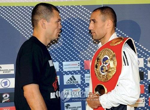 epa01542010 Boxer King Arthur Abraham (R) and his challenger Raul Marquez (L) pose for photographers during a press conference in Bamberg, Germany, 05 November 2008. Abraham will fight US Raul Marquez for the IBF World Middleweight Champion title at 'Jako-Arena' in Bamberg on 08 November 2008. Abraham fell sick at the beginning of October, which is why the first date of the fight had to be cancelled. EPA/MARCUS FUEHRER