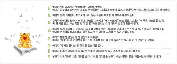 어휘력이 부족한 아이들은 글자로 된 책을 읽기가 힘들어 만화만 읽을 가능성이 높다. 따라서 아이가 만화에만 빠지지 않게 하려면 어휘력을 키워줄 필요가 있다. 한국독서교육개발원 남미영 원장은 그의 저서 <엄마의 독서학교>(애플비)에서 취학 전 아이의 어휘력을 높여주는 방법을 다음과 같이 제시한다.