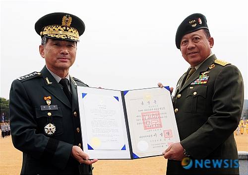 24일 오전 계룡대를 방문한 인도네시아 육군참모총장 아구스따디 사송코 뿌르노모(Agustadi Sasongko Pumomo·57·오른쪽) 대장이 한국정부를 대신한 임충빈 육군참모총장으로부터 보국훈장 통일장을 수여받고 있다. (사진=육군본부 제공)/박재용기자 ppjayo@newsis.com