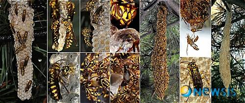 바쁘게 움직이는 이 벌들은 종족 본능의 기치로 뱀허물모양의 벌집을 짓고 사는가 보다. 지난 8월 한여름 더위가 기승을 부리던 날 국회 의원동산을 산책하다 발견한 잣나무가지사이로 보이는 쌍살벌집은 뱀허물모양으로 길게 늘어져 있어 눈길을 끌기에 충분했다.