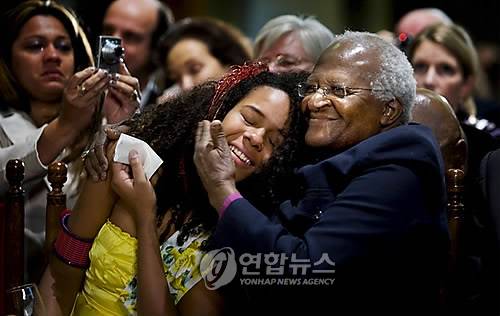 epa01567985 Archbishop Desmond Tutu (R) of Cape Town, South Africa, embraces Mayra Avellar Neves (L), winner of the International Children's Peace Prize 2008 during a official ceremony in the Knighthall (Ridderzaal) in The Hague, The Netherlands on 04 December 2008. Nobel peace prize laureate Desmond Tutu visits The Netherlands for several days. The International Childrens Peace Prize goes to someone who has made a significant contribution to advocating children's rights and improving the situation of vulnerable children. EPA/ROBIN UTRECHT