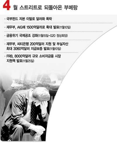 미국 등 6개 중앙은행은 18일 긴급 유동성 지원공조에 합의했다. 부시 대통령은 18, 19, 20일 연속 대국민성명을 내고 기자회견을 하며 7000억달러 구제금융안을 발표했지만, 불길은 이미 대륙을 넘은 뒤였다.