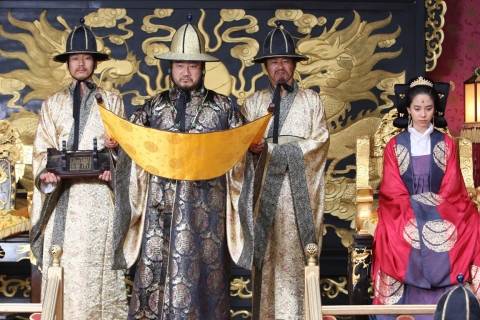 고려왕 주진모가 애써 울분을 억누른 표정으로 원나라 사신에게 고개 숙여 신하의 예를 취하고 있다. 이와는 대조적으로, 원나라 출신 왕후 송지효는 사신과 동등한 위치에서 왕을 내려다보고, 조정대신들은 눈 앞의 상황을 외면하는 기색이 역력하다. 대외적으로는 원의 억압, 대내적으로는 조정의 친원세력에 시달리는 고려왕의 깊은 분노를 담은 이 장면은, 원의 억압을 받았던 고려말의 굴욕적인 정치상황을 재현한 것.