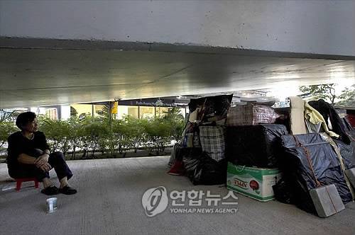 epa01578630 'Pablita', a homeless Filipina domestic helper, living under an overpass in Hong Kong's Central District, Hong Kong, China, 10 December 2008. Homelessness is a growing problem in Hong Kong as more and more people in the city lose their jobs and end up sleeping on the streets. The Hong Kong economy is currently in recession, being particularly vulnerable to the economic slowdown in both the US and China economies. EPA/ALEX HOFFORD