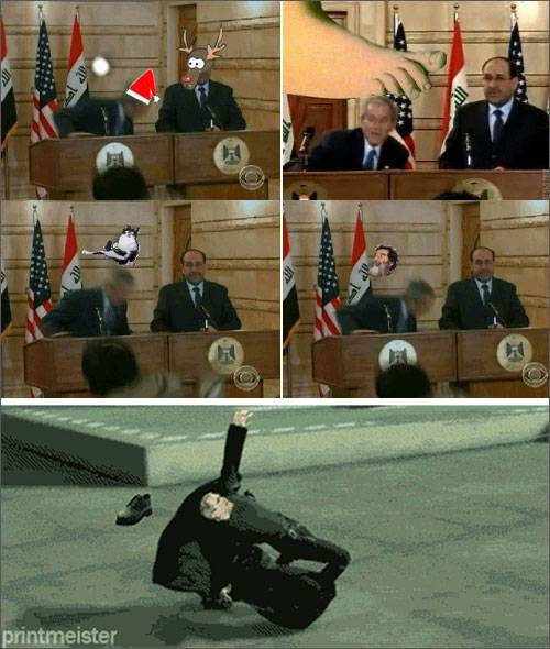 부시 대통령이 신발 봉변을 당하는 모습이 전파를 타자, 인터넷상에서는 벌써부터 이를 패러디한 영상과 게임이 쏟아지며 전세계 네티즌의 눈길을 사로잡고 있다.