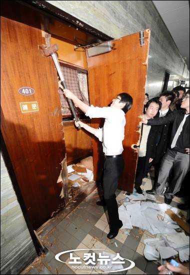 한나라당이 한미FTA 비준 동의안 상임위 상정을 강행하겠다고 한 반면, 민주당은 육탄 저지하겠다고 맞서 여·야의 물리적 충돌이 예상되는 가운데 18일 오전 서울 여의도 국회에서 의총을 가진 민주당과 민주노동당 의원 및 보좌진들이 안에서 막고 있는 외통위 회의실 문을 해머를 이용해 부수고 있다.