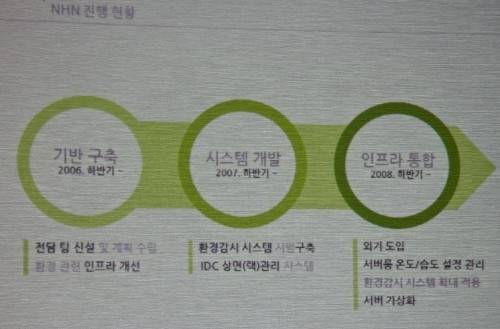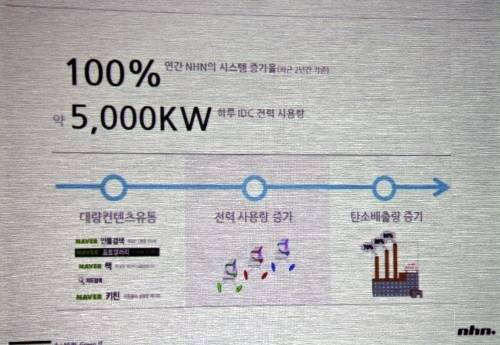 NHN은 지난 2006년부터 주요 전력 소비 부문인 IDC(인터넷데이터센터)의 에너지 소비를 효과적으로 줄이기 위한 전담팀을 구성하고 전력 사용량의 대부분을 차지하는 서버와 냉각 시스템의 전력 소비를 개선하기 위해 프로젝트를 진행해 왔다.