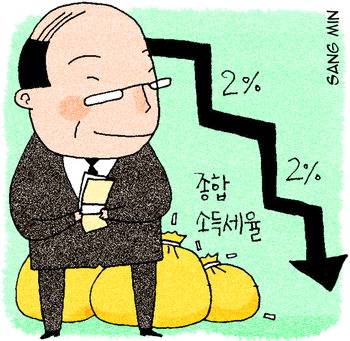 △종합소득세율 인하=종합소득세율이 2010년까지 단계적으로 과표 구간별로 2%포인트씩 인하된다. 과표 1200만원 이하는 내년에, 8800만원 초과는 2010년에 각각 2%포인트가 한 번에 내려가며, 나머지 구간은 내년과 2010년에 1%포인트씩 낮아진다. 내년에 과표 1200만원 이하는 6%, 1200만원 초과 4600만원 이하는 16%, 4600만원 초과 8800만원 이하는 25%, 8800만원 초과는 35%의 세율이 적용된다. 양도소득세 과표와 세율이 조정돼 종합소득세와 같아진다.