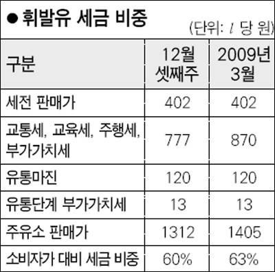 정유사의 세전 판매가는 402원이나 여기에 교통세와 교육세, 주행세, 부가가치세 등 각종 유류세 777원이 붙고, 다시 유통 마진(120원 안팎)과 이에 대한 부가가치세(13원)가 더해져서 세금만 800원 가까이 되는 것. 이는 7,8월 국제 유가 상승으로 휘발유 소비자가 대비 세금 비중이 45%까지 하락했던 것에 비하면 15%포인트 가량 높아진 것이다.