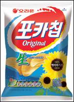 ▶오리온 포카칩=1988년 7월 출시된 감자칩의 대명사다. 포카칩은 국내 제과 시장에서 단일브랜드로 최고 매출을 올리고 있다. 감자를 원료로 하는 전체 스낵 시장에서는 20%, 생감자를 원료로 하는 시장에서는 30%의 점유율을 보이고 있다. 신선한 생감자를 얇게 썰어 175도에서 바삭바삭하게 튀겼다. 짭짤하면서도 담백한 햇감자 맛을 그대로 살려냈다. 2007년 5월부터 팜유 대비 포화지방 함량이 77%나 낮은 100% 해바라기유를 사용해 소비자들의 건강을 생각했다. 감자는 바삭함을 살리기 위해 얇게 자르는데 문제는 얇을 수록 부서지는 게 심하다는 것이다. 포카칩은 부서짐 현상을 제어하는 기술을 높였다. 또 원료가 되는 감자의 종자가 맛에도 큰 영향을 미치기 때문에 감자 연구소를 운영하며 품종 개량에 박차를 가하고 있다. 60g. 1200원.