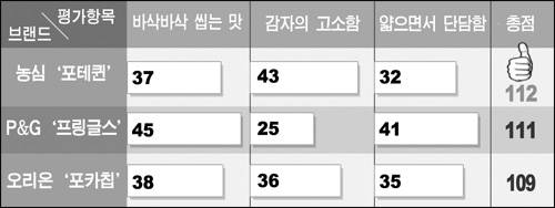 평가항목은 '바삭바삭하게 씹히는 맛', '감자 고유의 고소함', '칩이 얇아도 쉽게 부서지지 않는 단단함' 등 세 가지로 나눴다. 각 항목당 만점은 5점이었다.