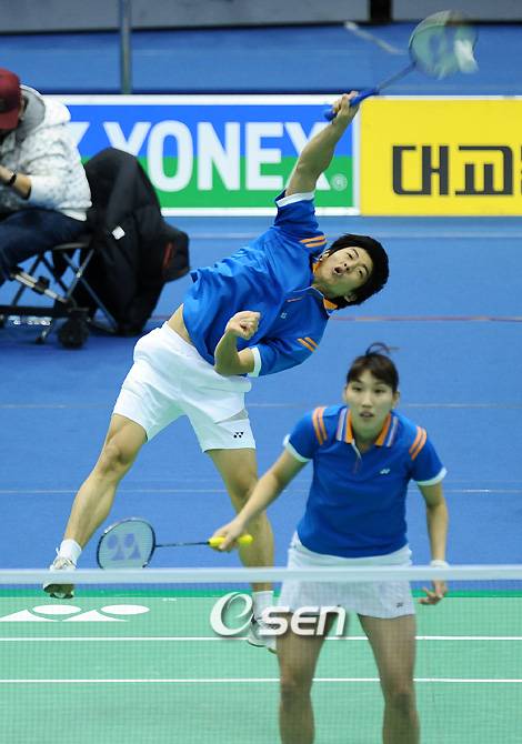 '2009 요넥스코리아 배드민턴 슈퍼시리즈' 혼합복식 8강 전 이용대-이효정 조와 인도네시아의 프란 쿠르니아완-셴디 이라와티 조의 경기가 16일 오후 서울 올림픽 제2체육관에서 열려 이용대-이효정이 세트스코어 2-0으로, 승리 4강에 진출했다. 이용대가 강한 스매싱을 넣고 있다./올림픽제2체=김영민 기자ajyoung@osen.co.kr