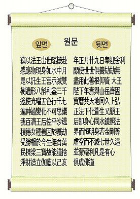 또 원하옵나니, 왕후의 신심(身心)은 수경(水鏡)과 같아서 법계를 비추어 항상 밝히시며, 금강 같은 몸은 허공과 나란히 불멸하시어 칠세(七世)의 구원(久遠)까지도 함께 복리를 입게 하시고, 모든 중생들 함께 불도 이루게 하소서.