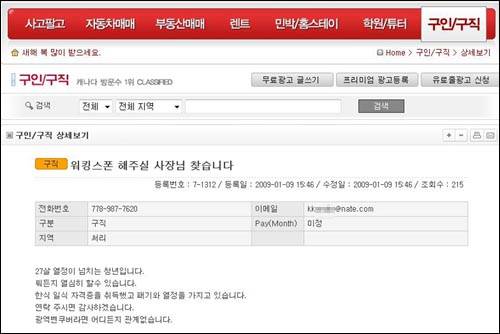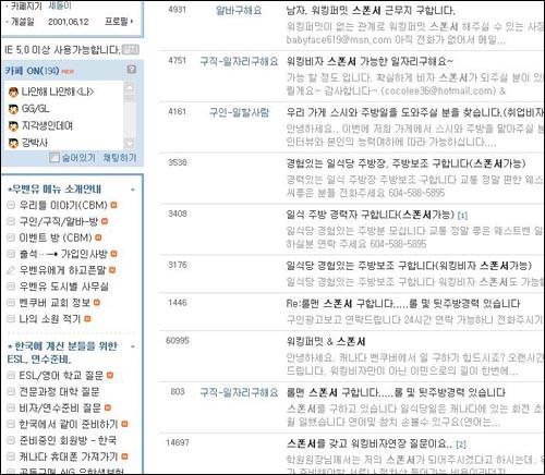 지난해 12월 중순 밴쿠버 한인 사이트 '밴조선'과 유학생 사이트 '우밴유'(우리는 밴쿠버 유학생)에는 스폰서를 구하려는 사람들의 한숨 섞인 글들이 도배됐다.