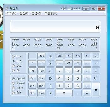 계산기. 일반, 공학, 프로그래머, 통계용 등 4가지 모드를 지원한다. 그림은 공학용 계산기. |